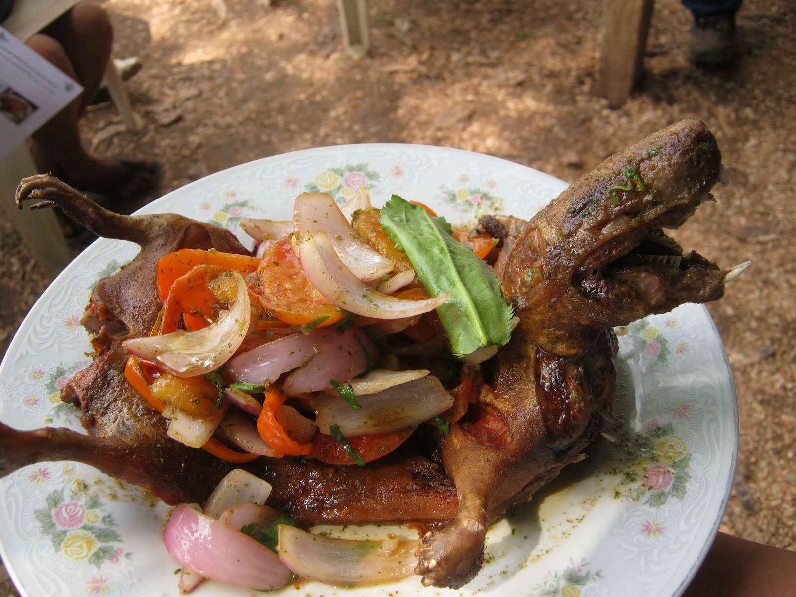 Otro plato exquisito a base de cuy con una crema de leche mantequilla y el sacha culantro, realmente delicioso aporte del Proyecto Huallaga para las mujeres rurales del valle del Sisa que acudieron a la feria de Sisa.